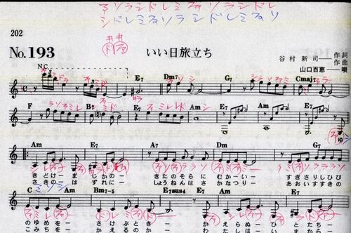 60の手習いで、ときどきトランペットを練習しています 手元の「いい日旅立ち」の楽譜は、音が低すぎるので、我流で移調しました なるべく半音が少ない音階に 実に機械的、原始的な方法で移調します 元楽譜の音を書いて、その下に移調音を書いていきます フ…
