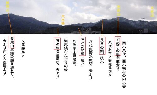 長門市三隅、市の橋から見た、中国山地です 左が権現山、右が天井山です 三隅側からは、地図を逆さにして見ます この地図には、まだ新しい八代ー三隅道路がかいてありません この山並みのことが、江戸時代の記録、地下上伸に書かれています 山並みに、文を並…