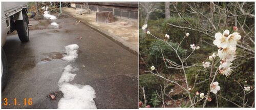 昨日はずいぶんあたたかくなりました 屋根から落ちた雪もとけ、梅が咲きました 三隅久原の方から、久原にはおってない「村上」という墓があると聞き、見にいきました 立派で、町人の墓ではないようです 両横に女性の名前、中央の人は、院をもらっていません …
