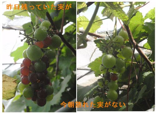 数日前から、デラウェアの熟れた実がなくなっていました 周りに網をおいて、入りにくくしましたが、今日は、ごっそり食べられました 前にあった足跡を消して様子を見ました 今朝は新しい足跡がありました 間違いなくハクビシンで、上から侵入してきた様子で…