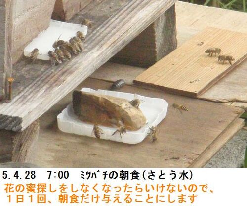 巣箱の前にさとう水を置くのを続けています 空の皿に、1匹のミツバチが待っていて、さとう水をいれたとたん、体をゆらしながら勢いよく吸い込んでいきました それから10分後には、ミツバチが群がっていました 今、春の花がいっぱい咲いているので、さとう…