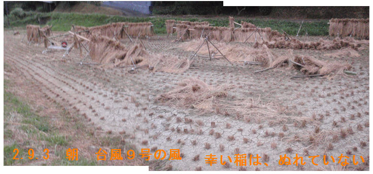 前の日、夜8時まで、倒れたなだらを起こしましたが、朝になると、ほぼ、倒れていました なだらの足とクイが残っています 台風まえに、こげばよかった
